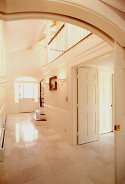 This home was renovated from a drab 1960s style to an updated yet classic reflection of the homeowners' tastes. A second-story family room with a balcony was added, and first-floor spaces were expanded and redesigned to include an acoustically perfect library and music room, an enlarged living room, dining room, front staircase and hallway space.